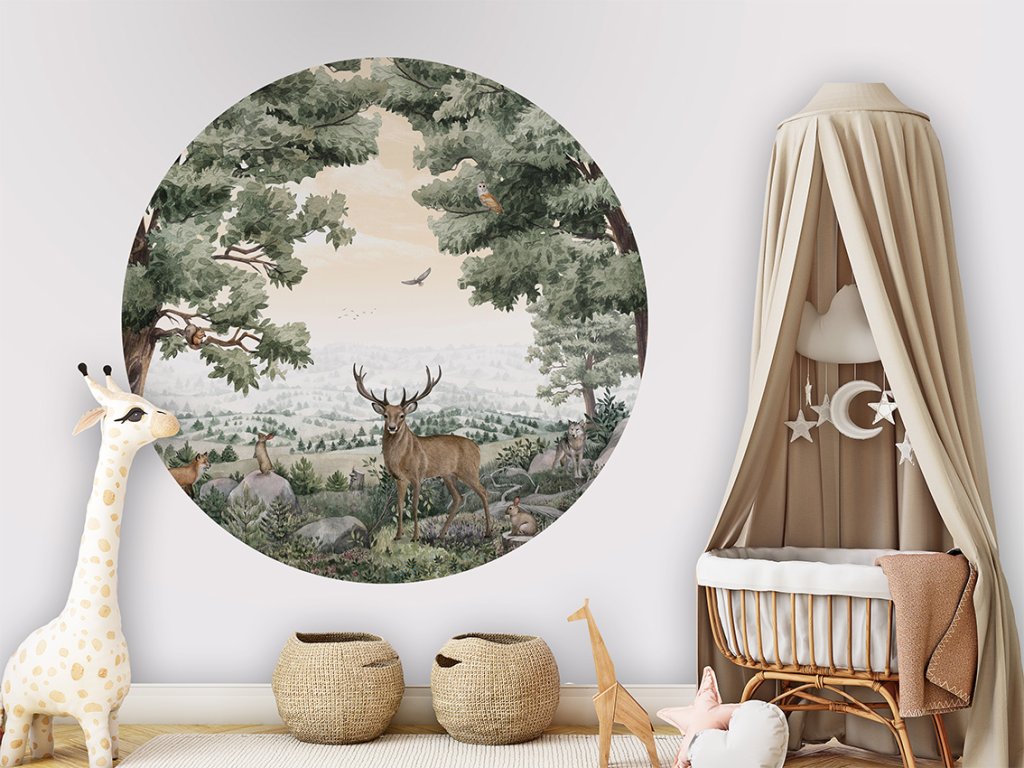 Dětský kruh Forest Vista zobrazuje otevřený lesní prostor s jelenem uprostřed krajiny a drobnými zvířaty kolem. Scéna působí vyváženě a klidně a navozuje pocit ticha lesa. Ideální dekorace pro pokoj laděný do přírodního stylu.