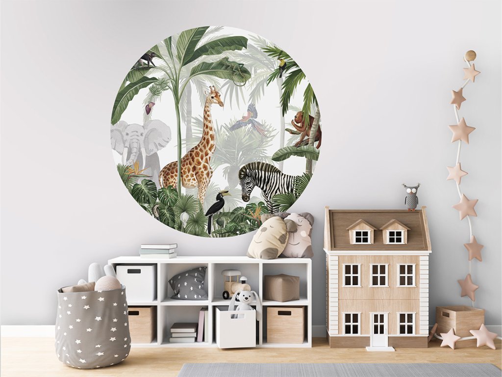 Dětský kruh Jungle Jive přenáší děti do světa tropické džungle plné palem žirafy zebry a exotických ptáků. Ilustrace je hravá ale zároveň vyvážená a podporuje fantazii i zvídavost. Skvěle doplní dětský pokoj laděný do přírodních tónů.