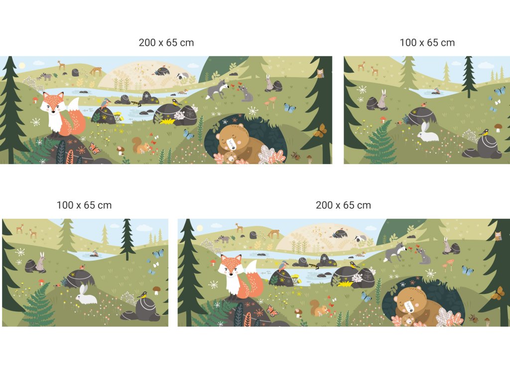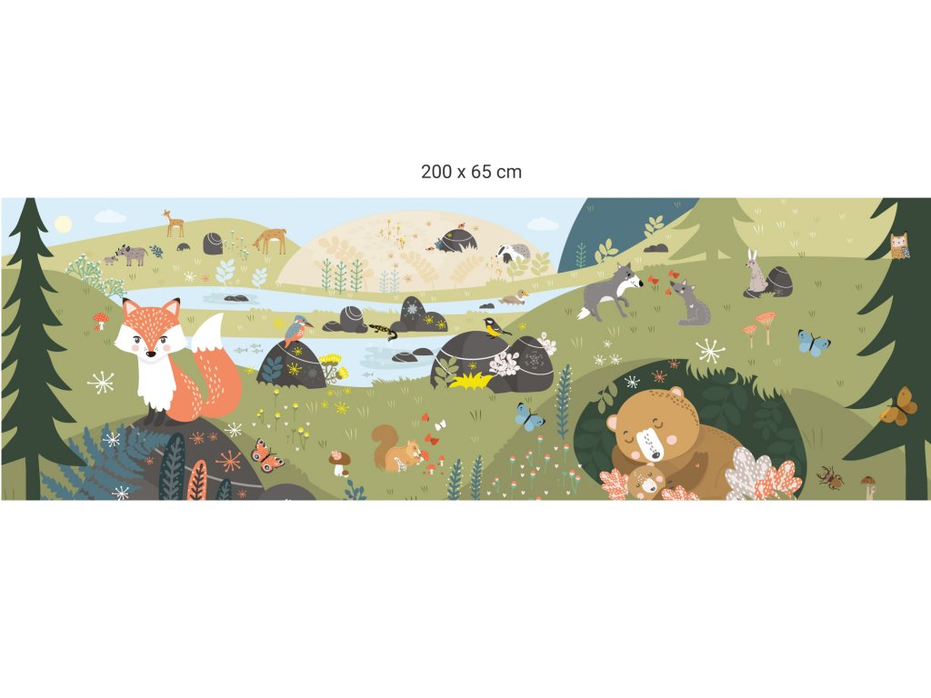 Krásná tapeta s motivem lesa Krakonošova zahrádka je plná zvířátek z našich lesů. Najdete na ní třeba lišku, medvěda, sýkorku, ledňáčka, jezevce, srnky, jelena, sovu, kachničku, zajíce, vlky, veverku, motýli, brouky a spousty kytiček, kytek, listí, kapradí, jezírko, potůček, smrky, stromy zkrátka všechno, co je v lese.