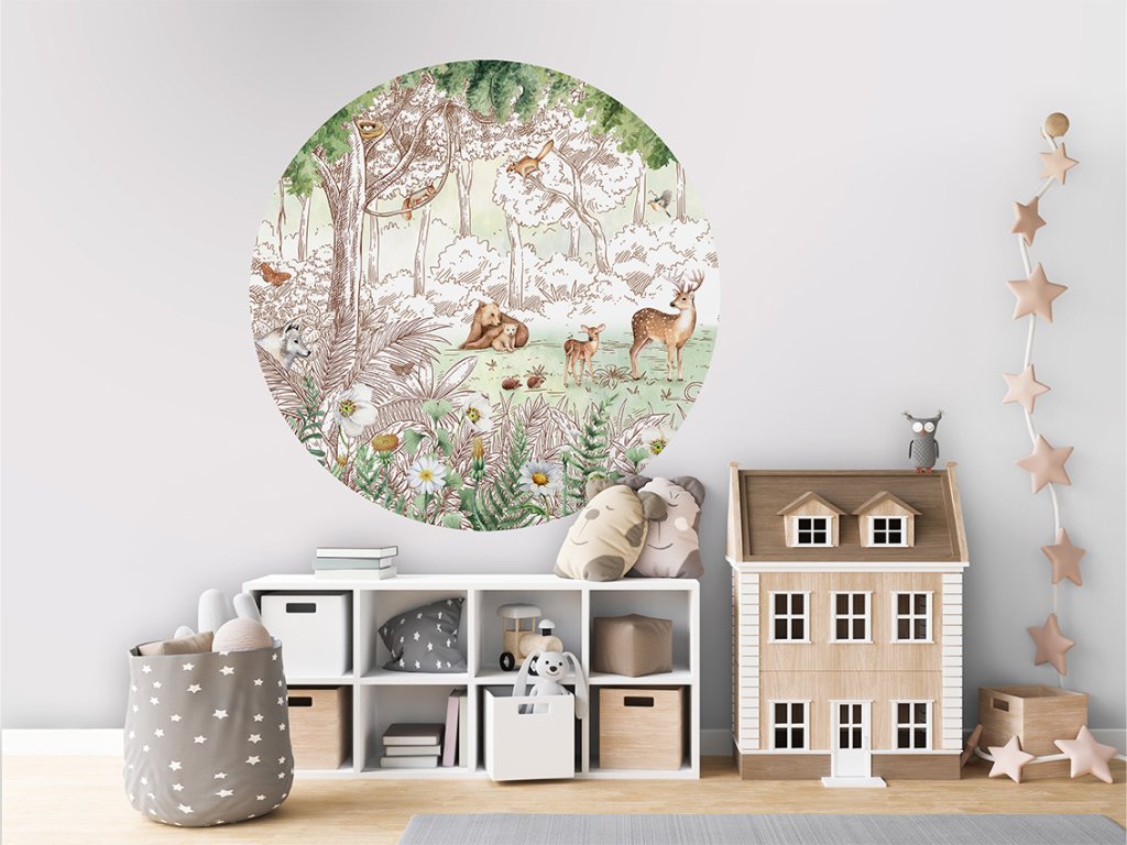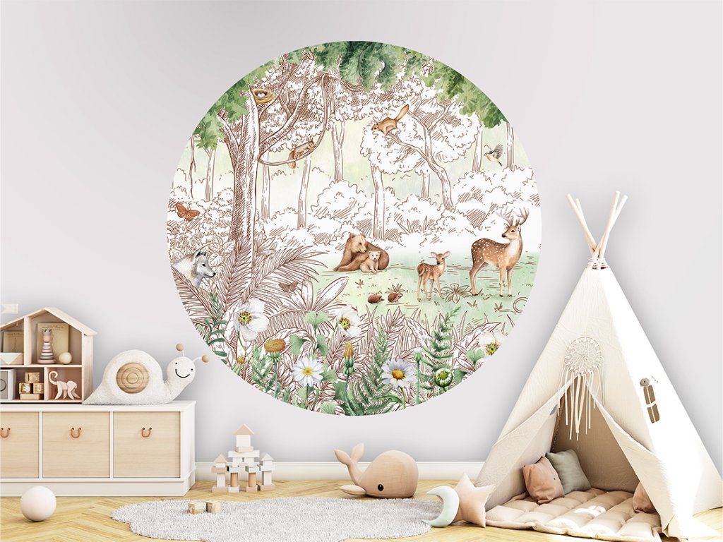 Kruhová tapeta Forest Friends Spring 1 kombinuje ilustraci lesa se svěží zelení a drobnými květinami. Motiv působí lehce a vzdušně a vytváří klidné prostředí dětského pokoje.