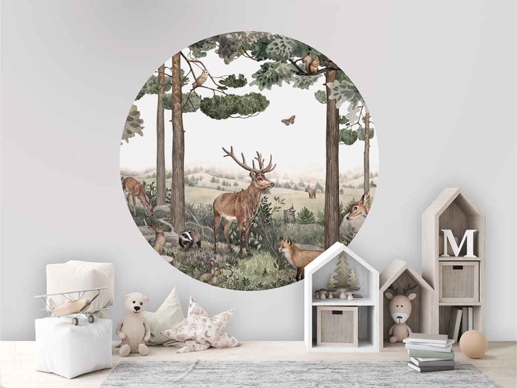 Kruhová tapeta Forest Jive představuje harmonickou ilustraci lesa s jemnými barvami a detailní kresbou zvířat. Dekor působí nadčasově a snadno se kombinuje s moderním stylem.