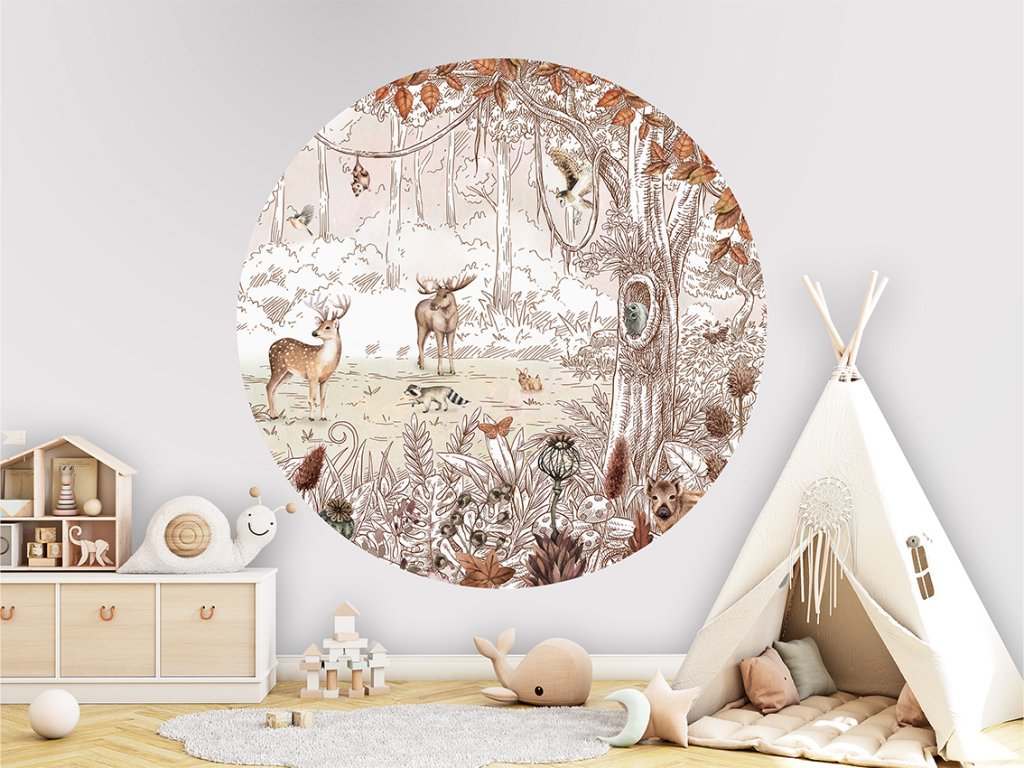 Kruhová tapeta Forest Friends Autumn 2 nabízí detailní kresbu lesního prostředí v teplých tónech. Dekor vytváří klidné prostředí vhodné pro miminka i větší děti.