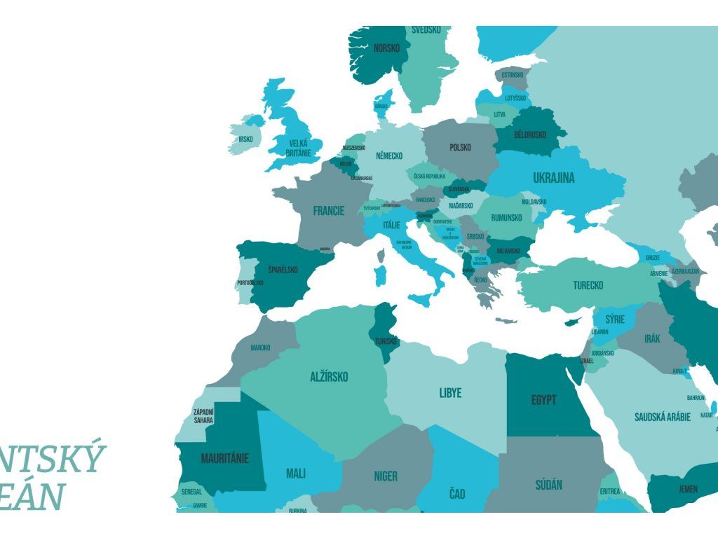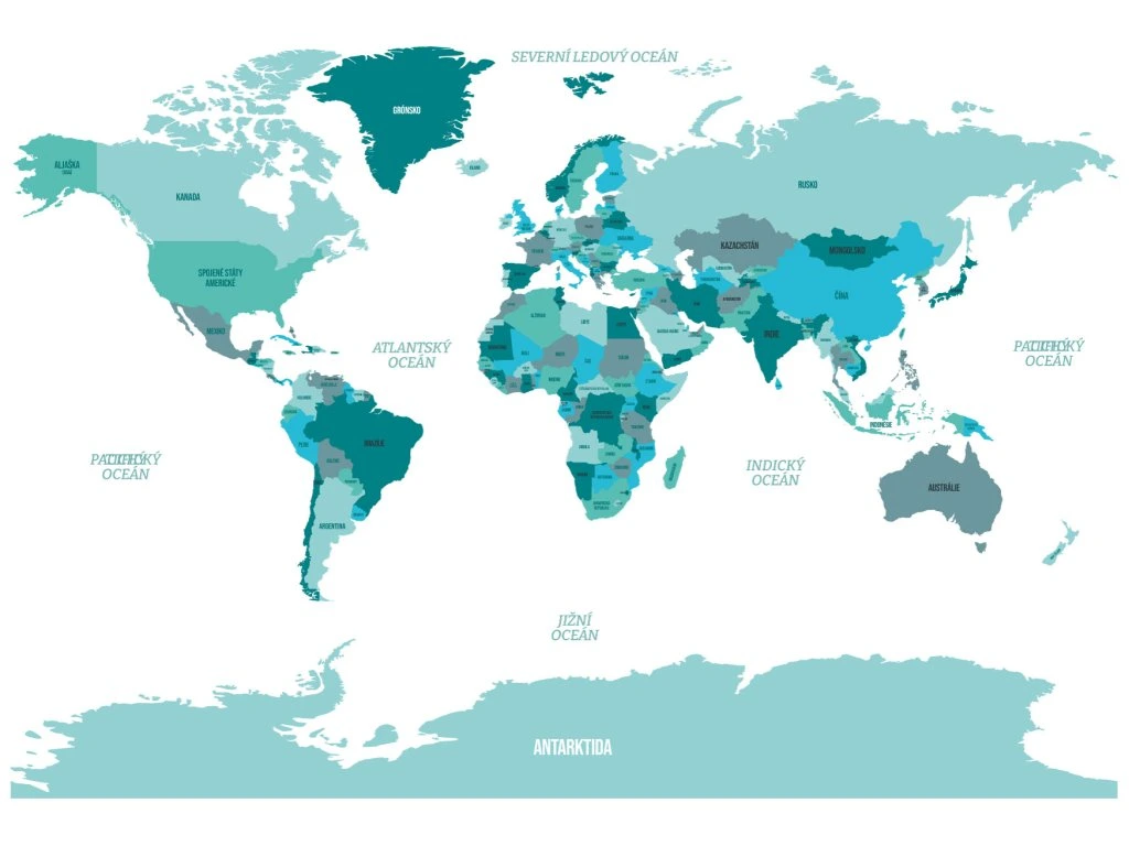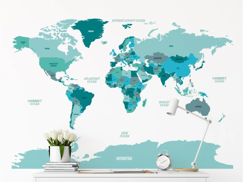 Mapa světa na zeď modrá - Samolepka na zeď - česky