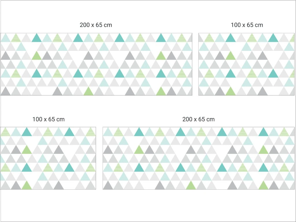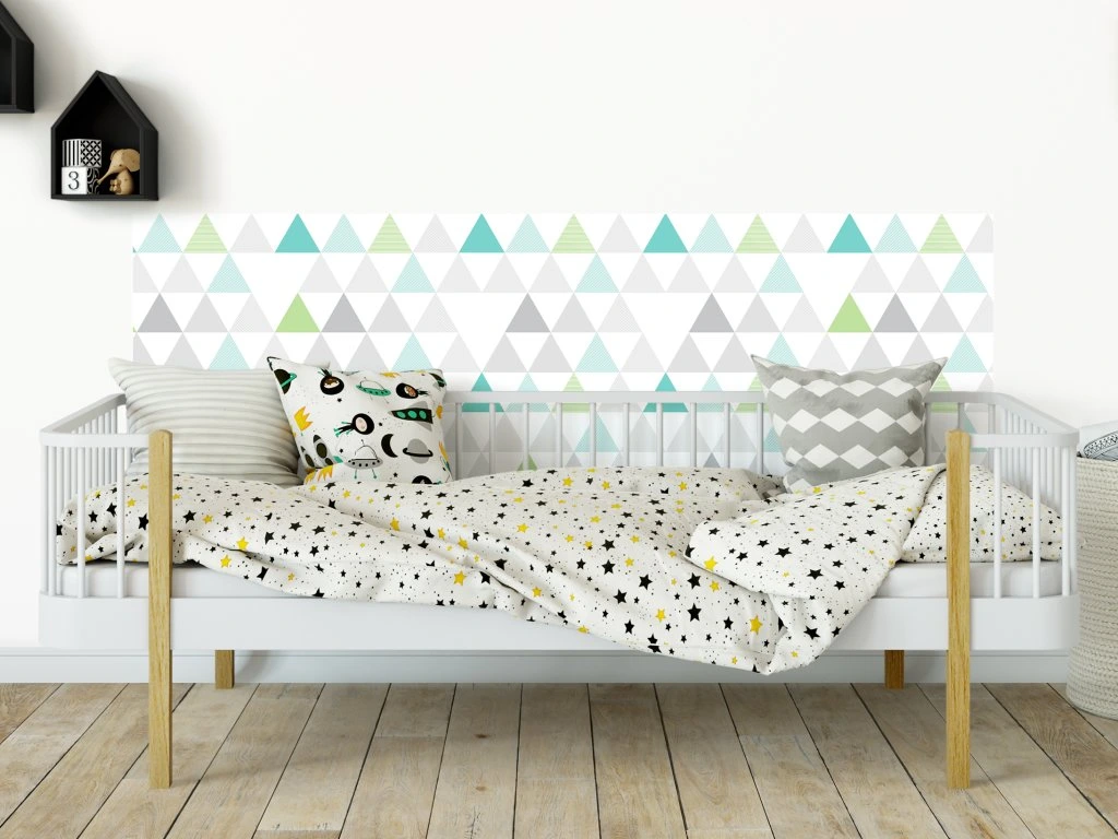 Ochrana stěny za postel pro děti s motivem trojúhelníků. Ochrání zeď za postelí proti ušpinění. Díky speciálnímu přemístitelnému lepidlu dobře drží a lze snadno sundat bez poškození zdi.
