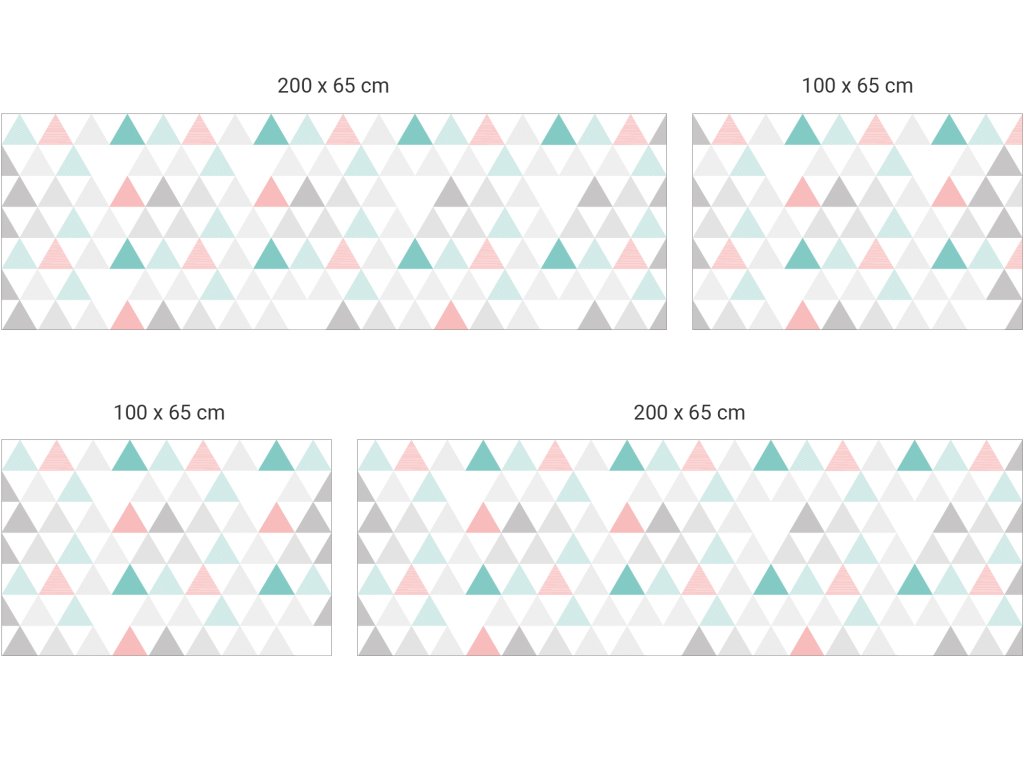 Ochrana stěny za postel pro děti s motivem trojúhelníků. Ochrání zeď za postelí proti ušpinění. Díky speciálnímu přemístitelnému lepidlu dobře drží a lze snadno sundat bez poškození zdi.
