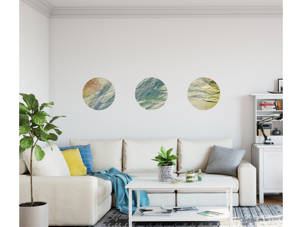 Naše samolepicí kruhy jsou vyrobeny z unikátního přelepovacího materiálu, který svým vzhledem připomíná jemné plátno. Materiál se netrhá a krásně přilne ke zdi. Při správném lepení nevznikají žádné vlnky ani bublinky a pokud ho omylem nalepíte špatně, vše velmi snadno opravíte. Interiérová dekorace nezanechává stopy lepidla. Tiskneme k přírodě šetrným UV-gelm tiskem.