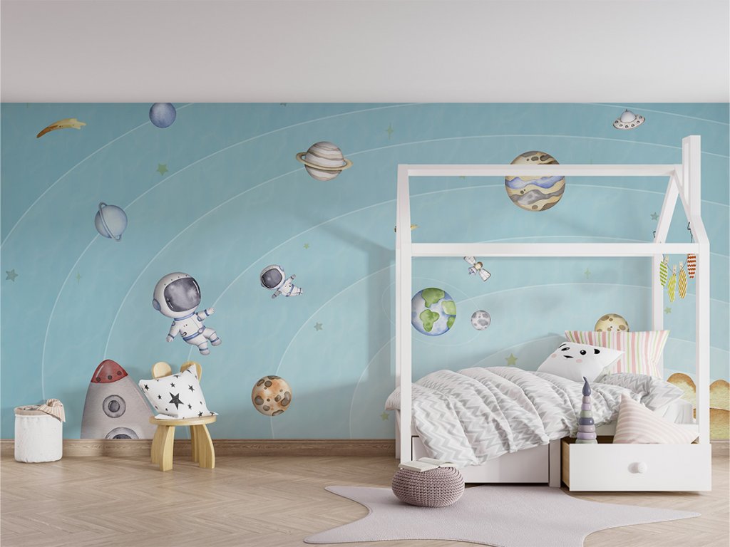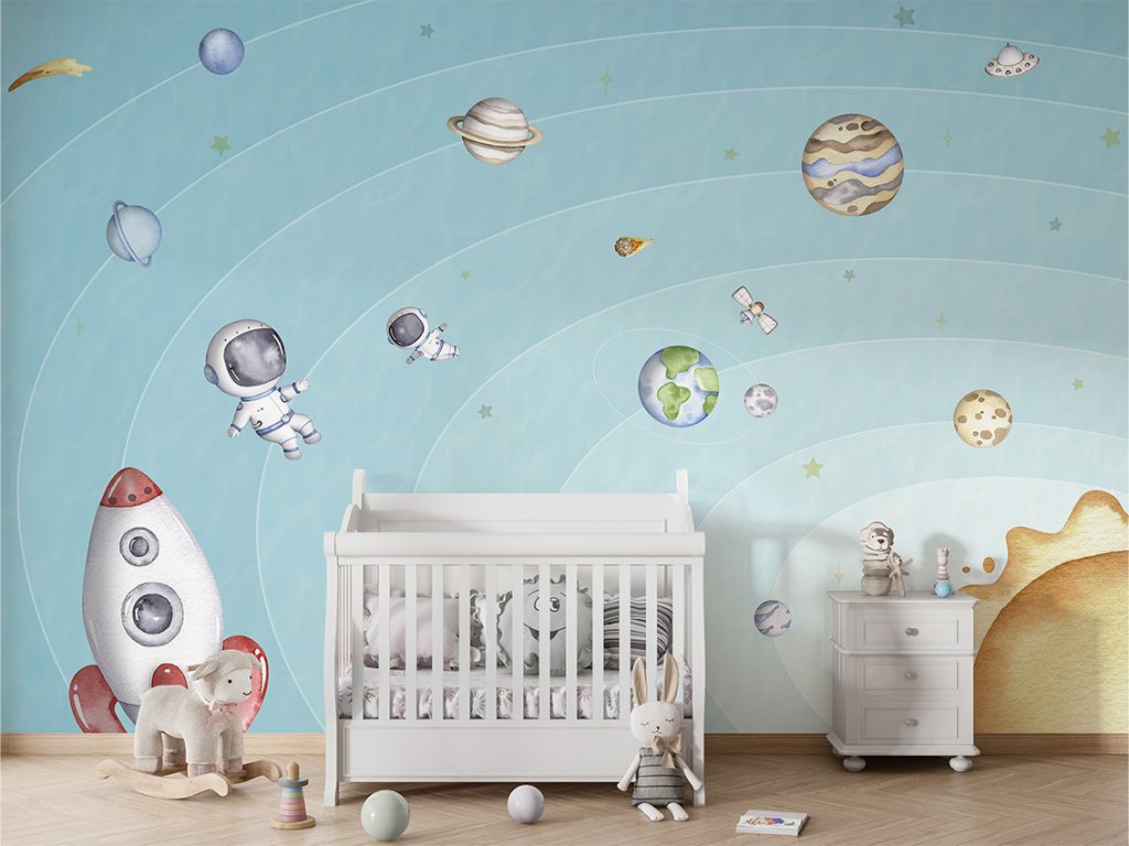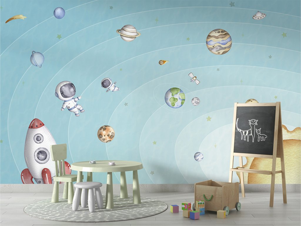 Krásná eko tapeta pro malé děti s kosmonauty, hvězdičkami, planetami. Tapeta s vesmírem v populárním akvarelovém stylu. Vysoce kvalitní eko tapeta. Kvalitní k přírodě šetrný tisk, ekologické materiály. Bez pvc. Tapety pro děti nabízíme ve dvou variantách. Samolepicí tapetu nebo tapetu vliesovou. S oběma se pracuje velmi dobře.