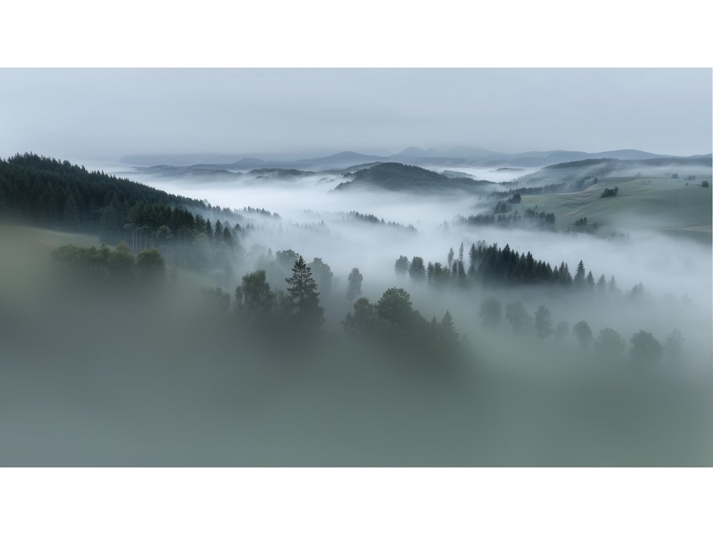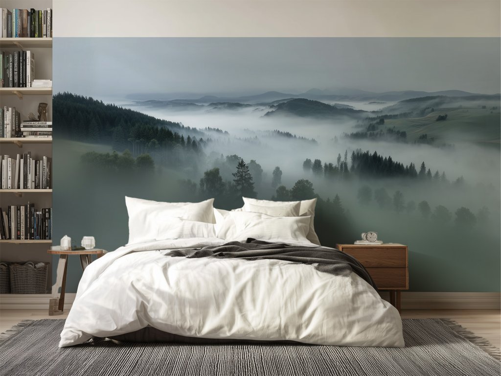 Tapeta s motivem krajiny v mlze, zachycená z ptačí perspektivy, vnáší do interiéru klid, hloubku a jemnou melancholii. Siluety stromů, zvlněné kopce a jemné mlžné závoje působí realisticky a zároveň uklidňujícím dojmem.