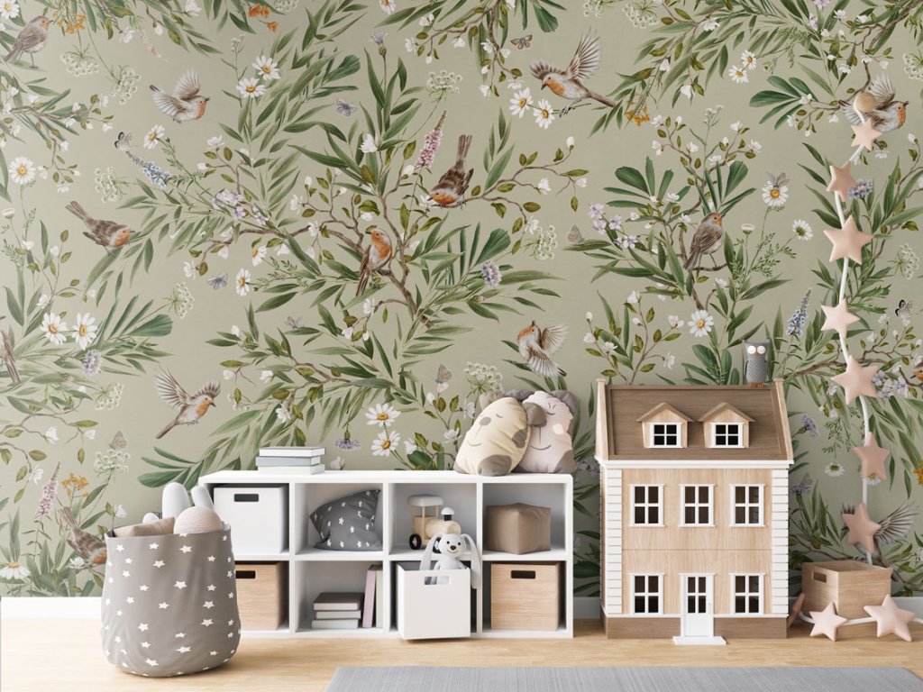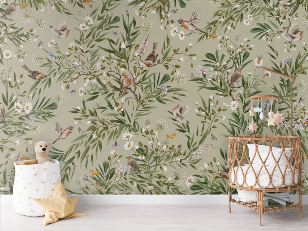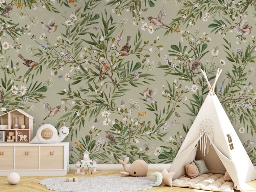 Tato elegantní tapeta s motivem ptáků a květin působí mimořádně harmonicky a klidně. Na světle béžovém podkladu se rozprostírají červenky mezi větvičkami, listy a drobnými květy v jemných hnědých a měděných odstínech. Celý motiv působí jako ručně malovaný akvarel – přirozený, lehký a dokonale ladící s přírodními materiály, dřevem i textiliemi v neutrálních barvách.
