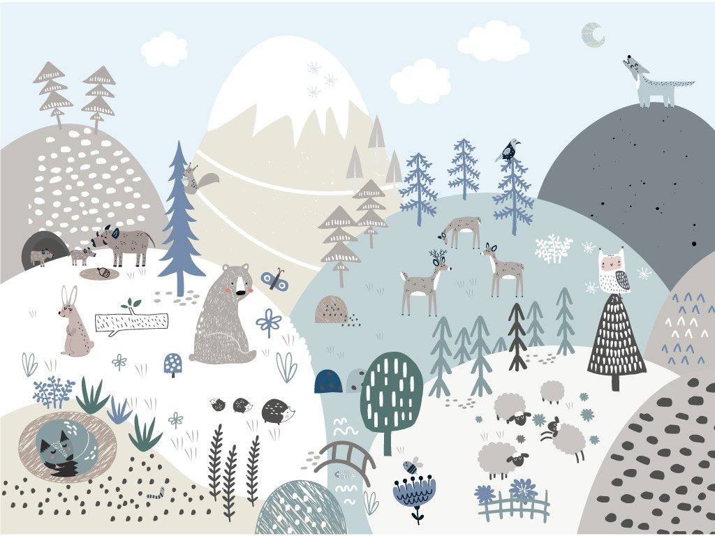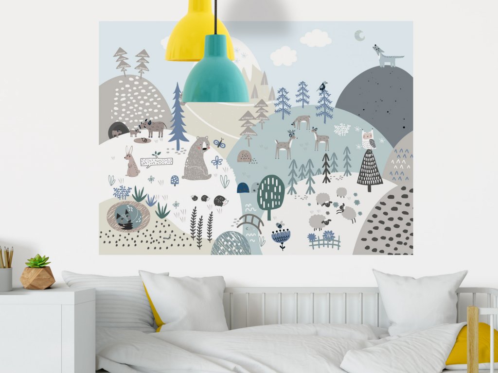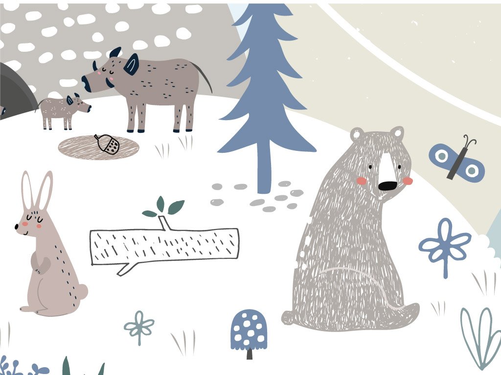 Plakát s ilustracemi medvěda, jelena, srnek, ježků, zajíce a dalších lesních zvířat v přírodě.
